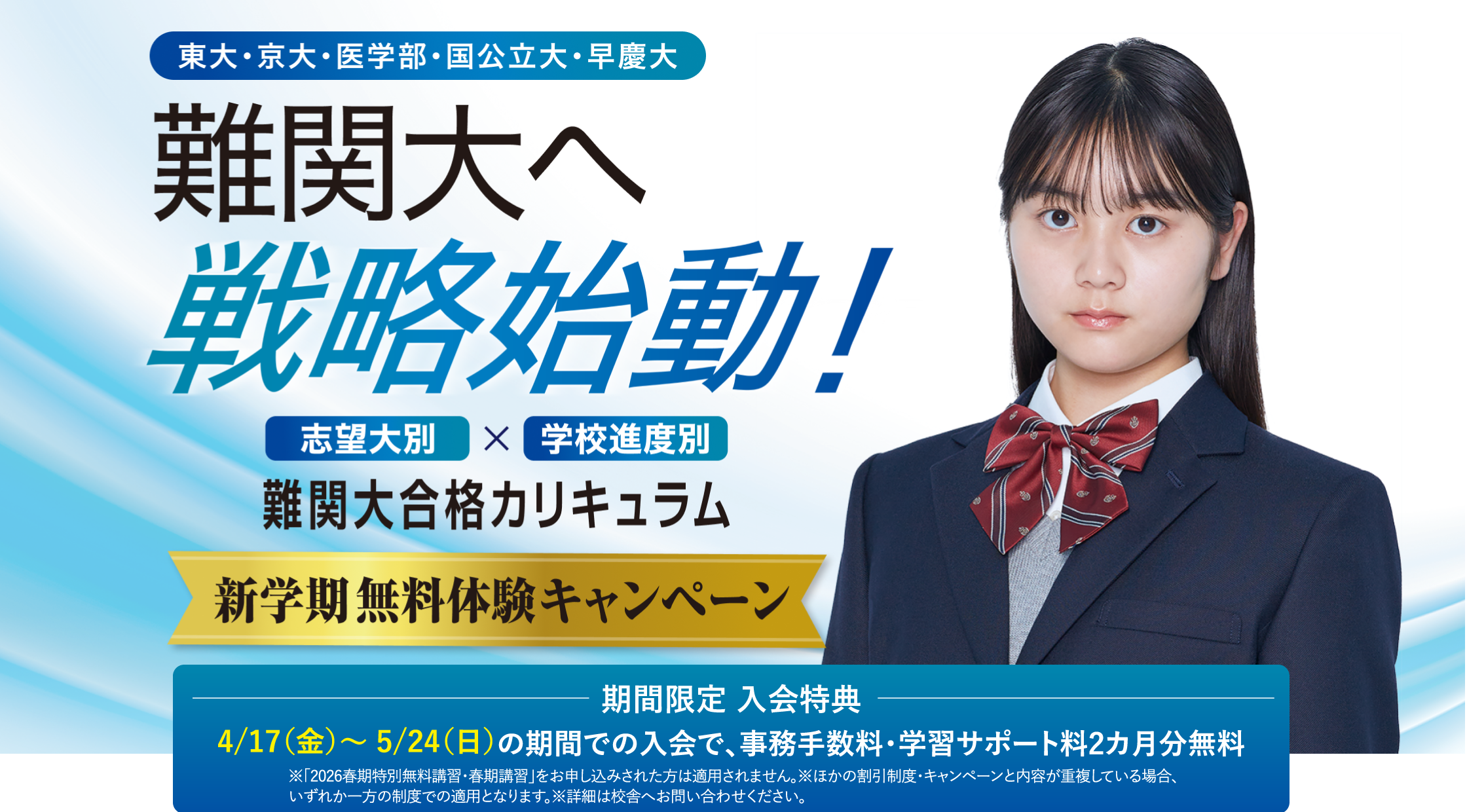 4/17(金)~5/24(日)の期間での入会で、事務手数料・学習サポート料2カ月分無料※「2026春期特別無料講習・春期講習」をお申し込みされた方は適用されません。※ほかの割引制度・キャンペーンと内容が重複している場合、いずれか一方の制度での適用となります。※詳細は校舎へお問い合わせください。
