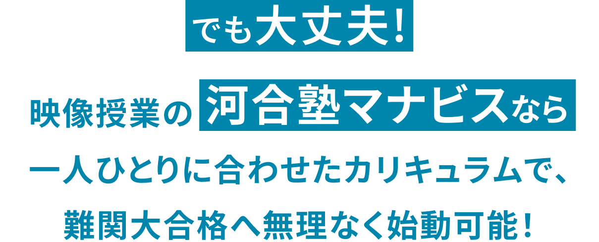一人ひとりのレベルと志望大に合わせ、ベストなカリキュラムを提供。だから難関大へ激伸び合格!講師・教材・指導はすべて河合塾のノウハウが詰まった信頼の映像予備校です。