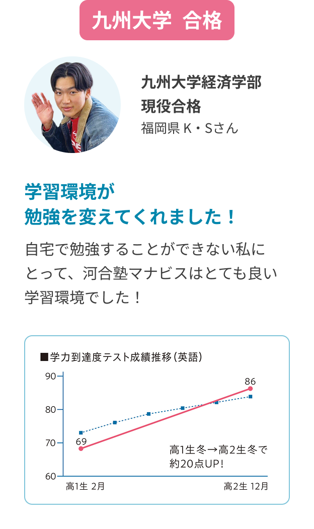 ※河合塾マナビスの到達度テストで合格者平均以上に成績を伸ばして合格した先輩の体験談です。成績の伸びには個人差があり成果を保証するものではありません。
