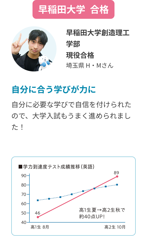 マナビスは自分の成績に応じて科目ごとにレベル設定ができるので、弱点を置き去りにはしません。難関大合格をめざすなら、基礎力に穴が空いている状態や苦手科目がある状態では成功を掴み取ることが難しくなります。着実に早期に苦手を挽回して、合格レベルに成績を引き上げましょう。