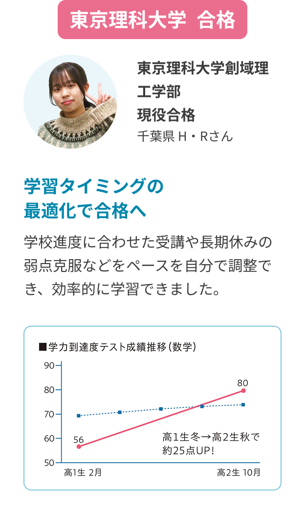 講座の難易度が幅広いため自分の学力に適した授業を受けることができ、無理なく学習を進められました。また、苦手分野を再受講できることは成績向上に大いに役立ったと感じています。