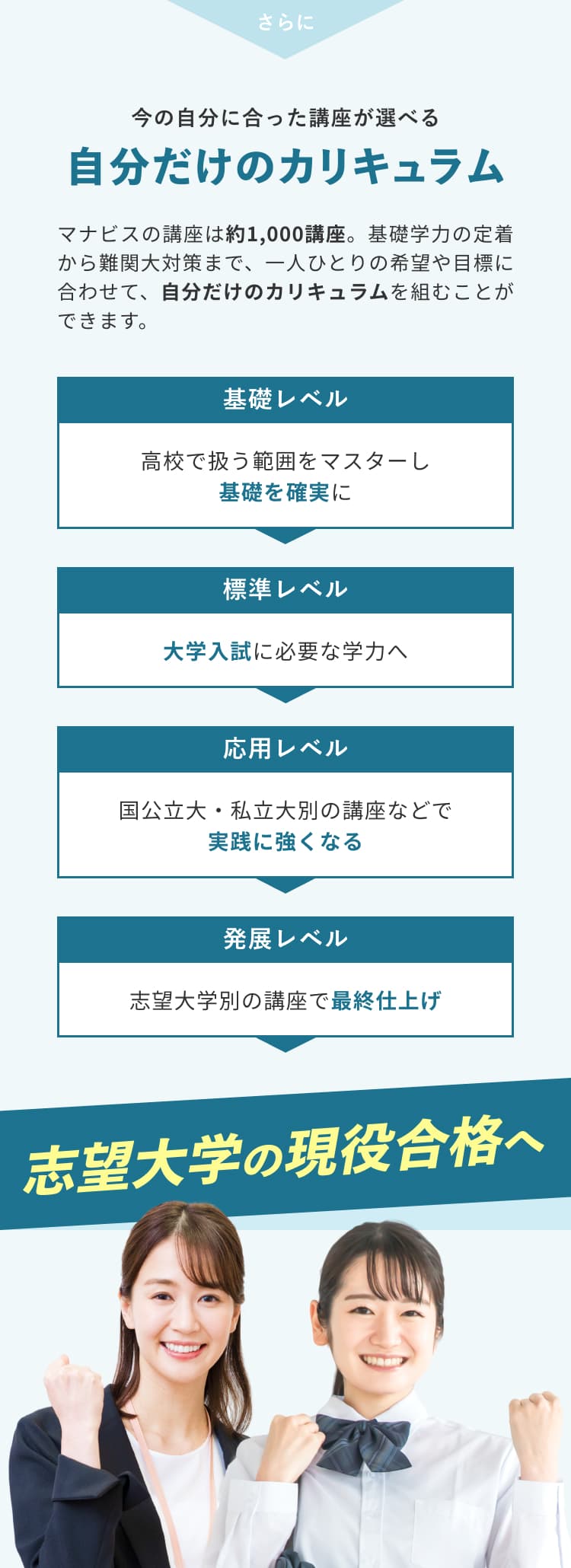 マナビスの映像授業は、全国の河合塾のなかでも、わかりやすさで受験生の支持を集める人気講師たちが担当。理解のツボを押さえた熱気あふれる授業を体験してください!