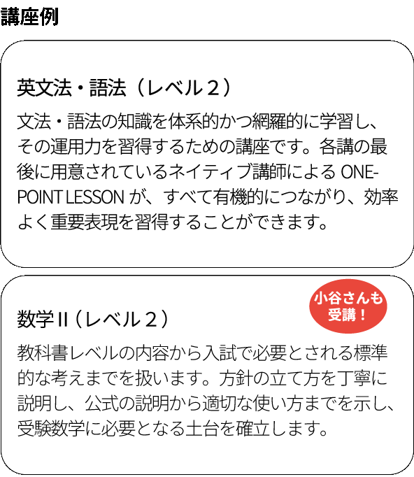 約1000講座のラインナップの中から、自分に本当に合った講座を選択することができます。現状の学力を踏まえ、入試からの逆算で時期に合わせてやるべきことを整理し計画を決定。あなたに本当に必要な講座を、やるべきタイミングで進めることができます。ここまで細かく合格へのプロセスが描けるのは河合塾グループならではです。