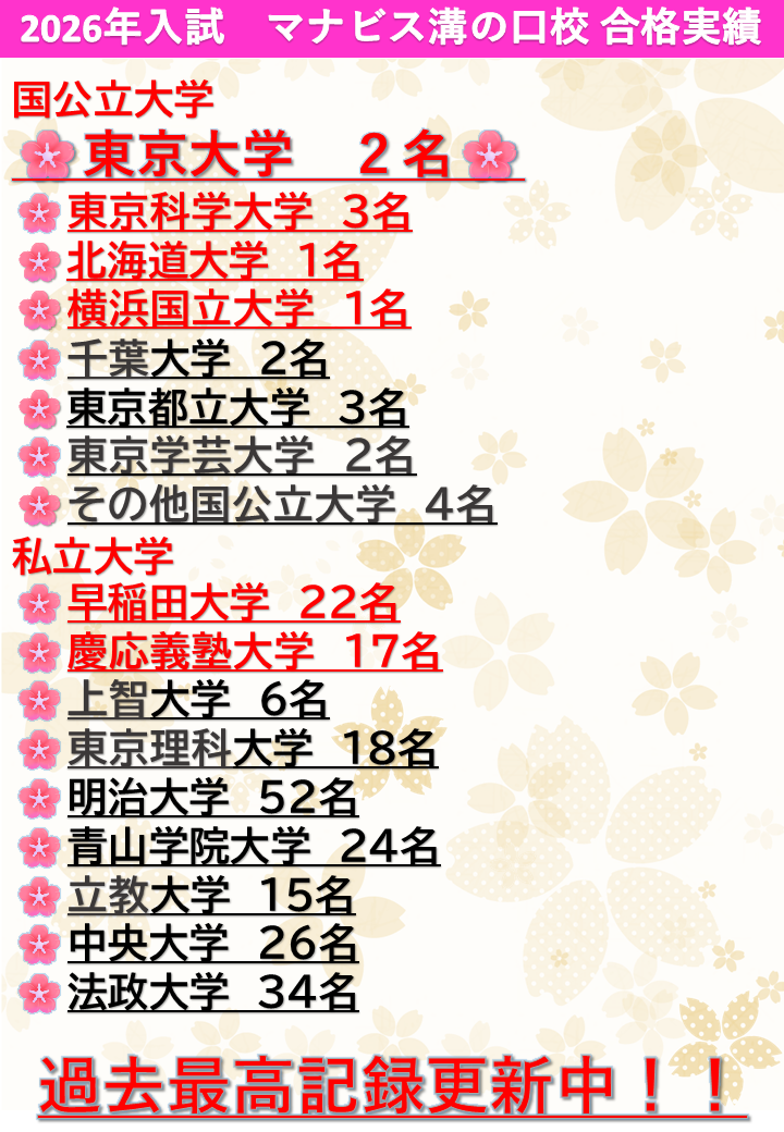 家から近く、レベルの高い友人もいて通いやすく、授業も自由に受けれたので快適でした。効果的な学習方法はマナビスで早め早めに予習し、学校でその範囲をやるときに友人に教えるなどして忘れかけていたことを覚えなおし定着させることです。