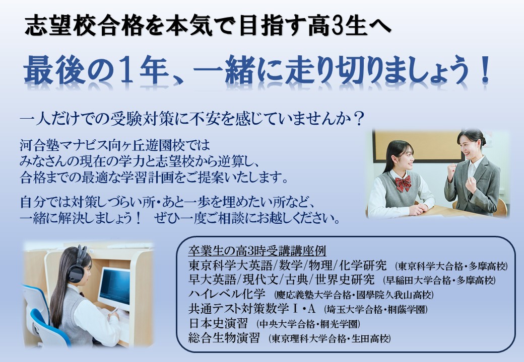 マナビスのテキストや講座で基礎を固めることができました。自分はあまり復習の習慣がなかったのですが、受講後に受ける習得度テストのおかげで大事なところを復習し、自分の実力を伸ばすことができました。受講が終わった後にスタッフの方から勉強計画のアドバイスをしてもらい、過去問演習や復習をたくさんしたことで第一志望校に合格することができました。