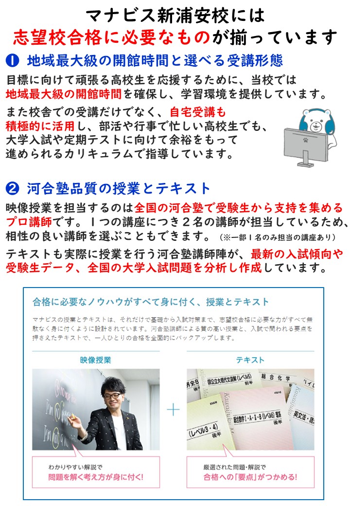 自分一人では何から始めればよいのかが分からなかった中で、河合塾マナビスのテキストは良問がたくさんあって、説明も細かく書いてあり使い勝手が良かったです。アドバイザーの方も話しやすい方が多く相談もしやすかったです。入試直前期は学校もない中で友達と話せませんでしたが、アドバイザーの方と話すことで緊張をほぐせました。