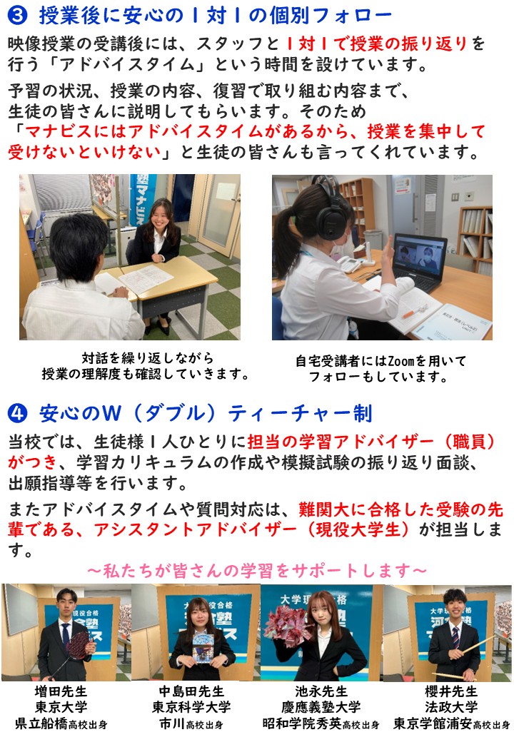 朝の早い時間から夜の遅い時間まで開いてくださっているおかげで部活の後や自分の好きな時間に行くことができ、学習習慣がついたと思います。また、動画を視聴する方式なので一時停止しながら見たり、何度も見返せるところが良かったです。アドバイスタイムでは楽しく学んだことを復習でき、受験に関する質問もできるのでとても良い時間でした。