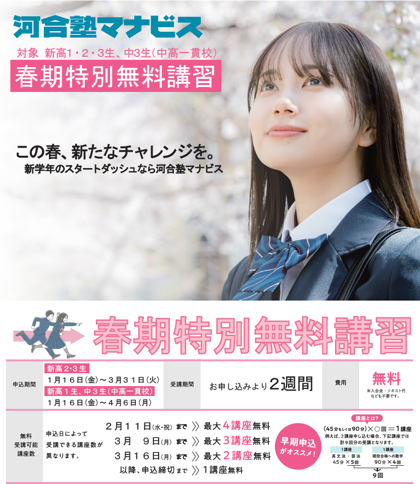 【新高2生へ】最大4講座無料!新学年のスタートダッシュを決める「春期特別無料講習」受付開始
