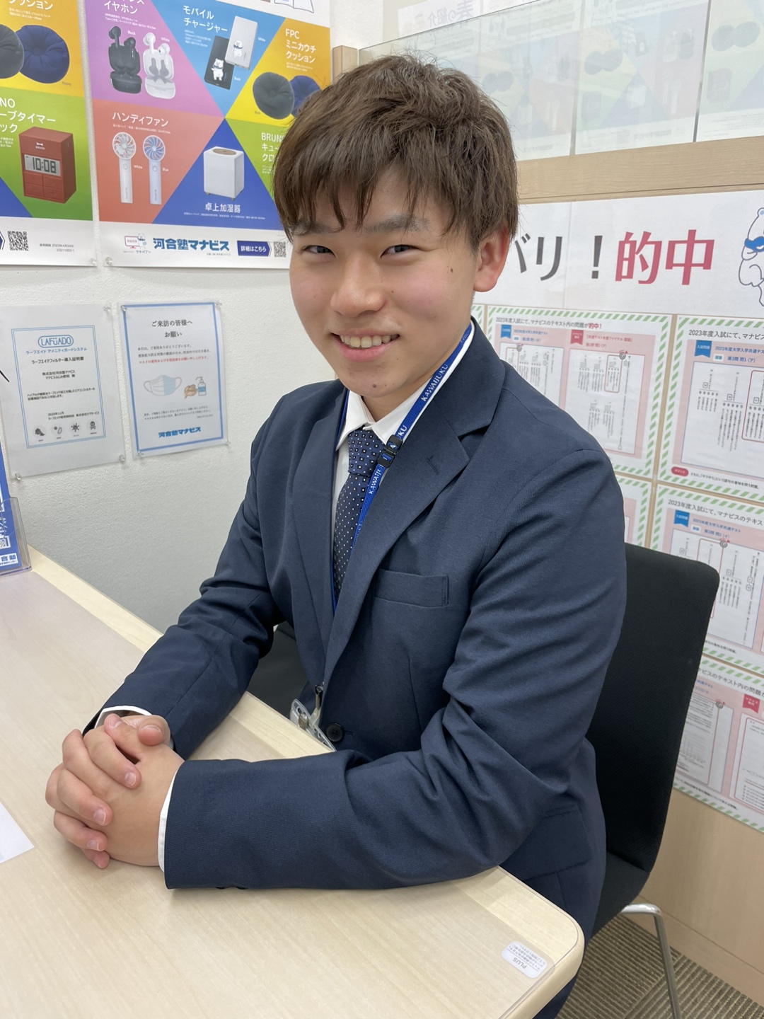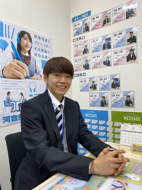 自分は高校2年生の終わりまで部活動ばかりに時間を使っておりあまり勉強が出来ておりませんでした。そのような中で河合塾マナビスに入会することで机に座る習慣を身につけることが出来ました。講座を受けた後にはアドバイザーの方に丁寧にわからないところを教えていただきとても勉強になりました。また大学受験の先輩として校舎スタッフの方からたくさんの体験談やアドバイスが聞けてとても良かったです。