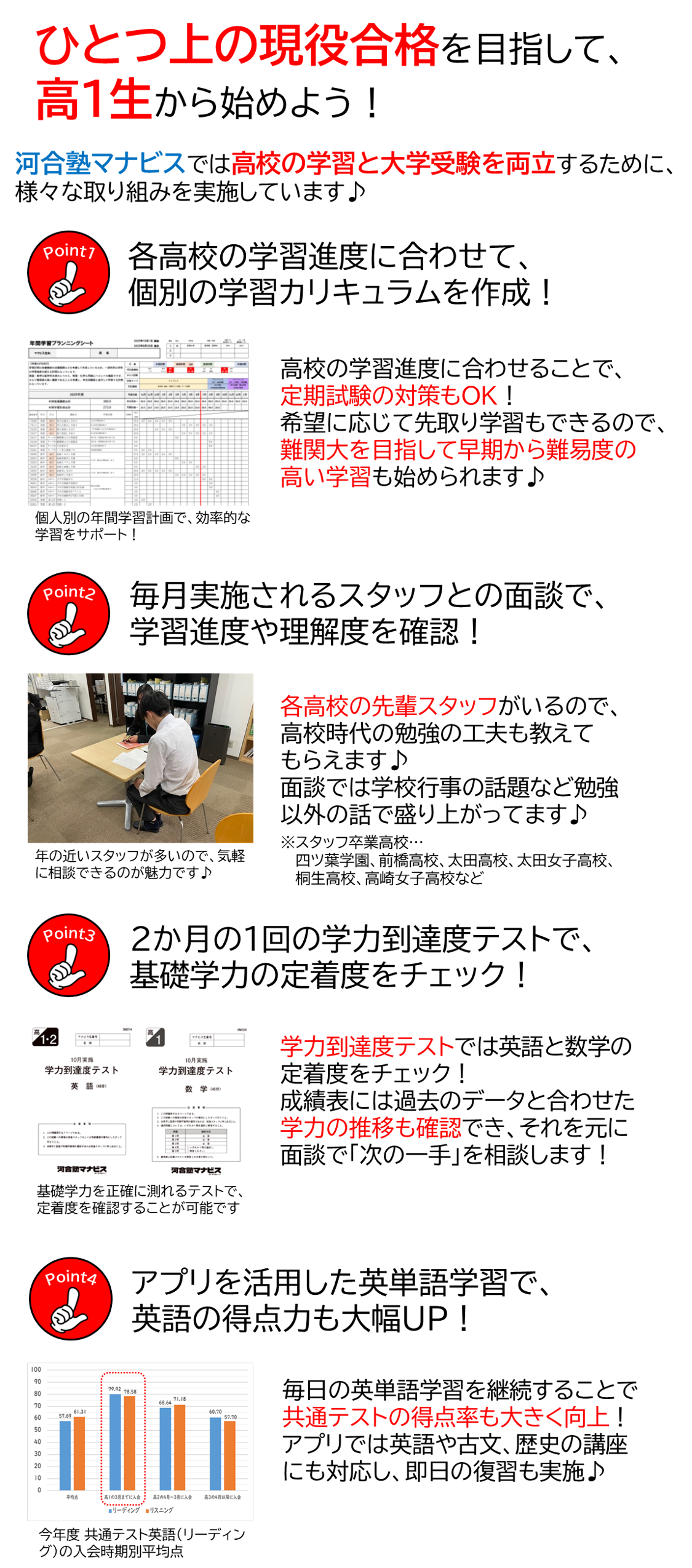 もともと英語が苦手で入会時の学力診断テストは30点台でしたが、単語と河合塾マナビスの講座だけ徹底した結果、英検2級(スコア2200)を取得でき、共通テスト模試のリーディングでは安定して80%以上得点できるようになりました。
