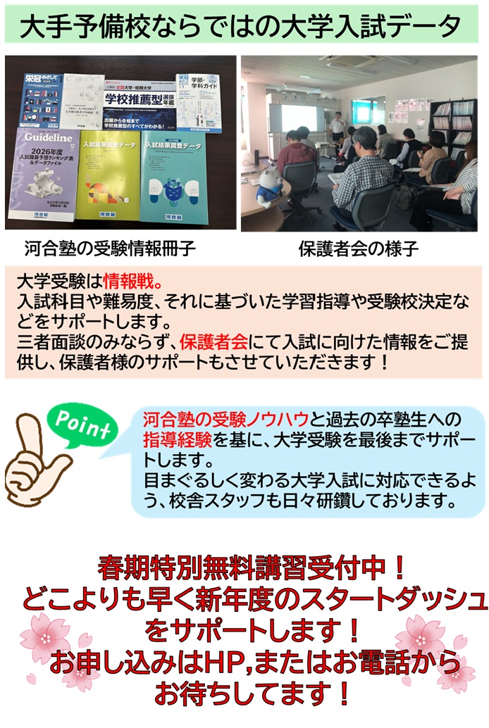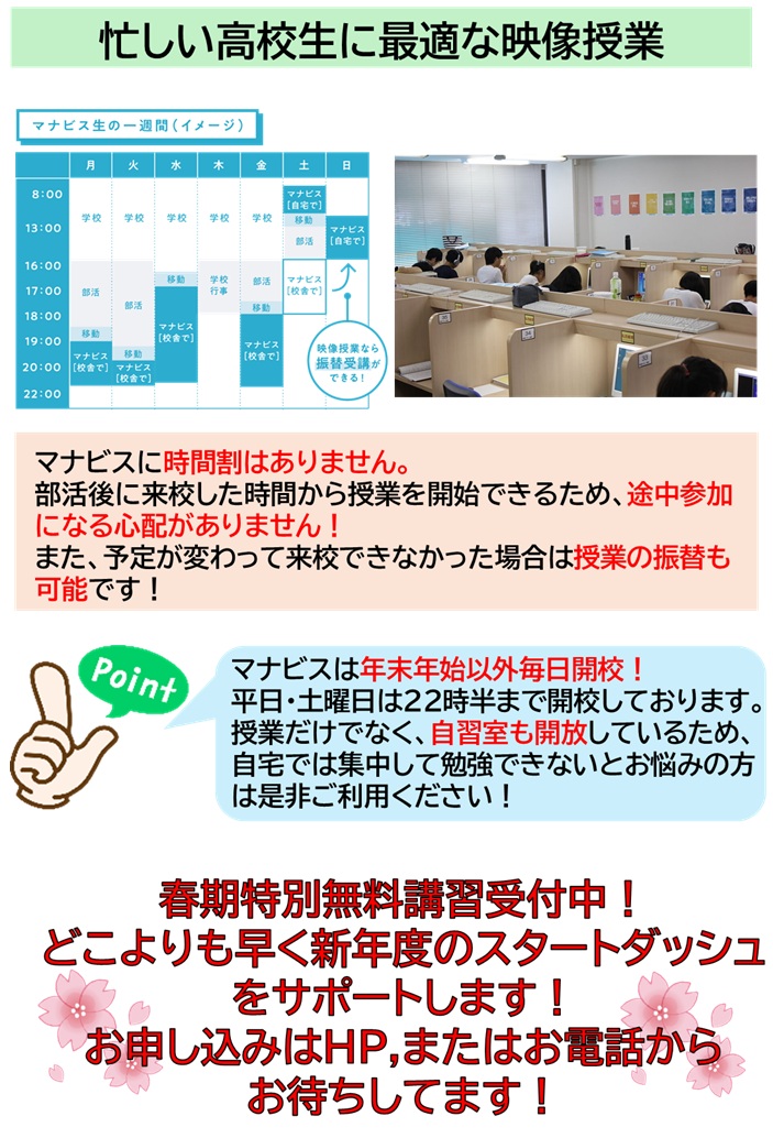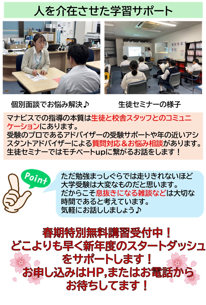 河合塾マナビス入会前は不安な教科が多すぎて、何をしたらよいのかわからない状態でしたが、入会する前のテストで自分の特に苦手な分野について説明してもらったり、スケジュールを作成してもらい、自分のやるべきことを明確にできたことがよかったです。アドバイザーの方が優しく教えてくださったので、自信を持って勉強に取り組めました。