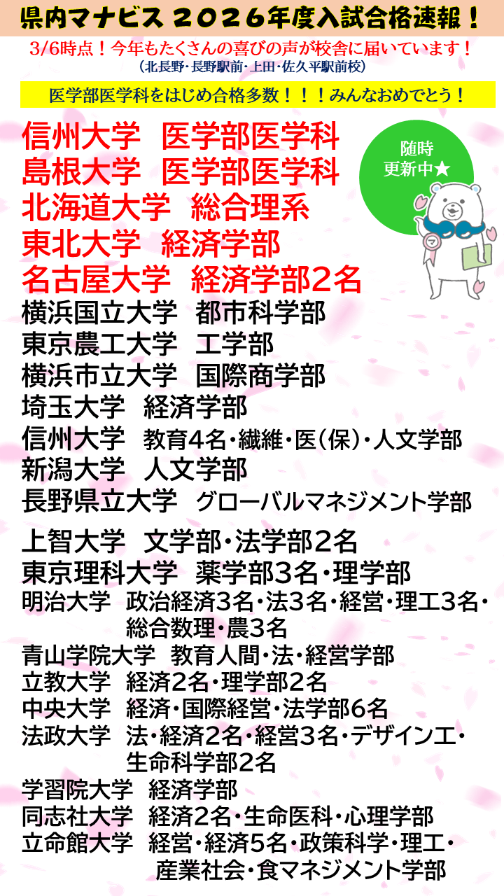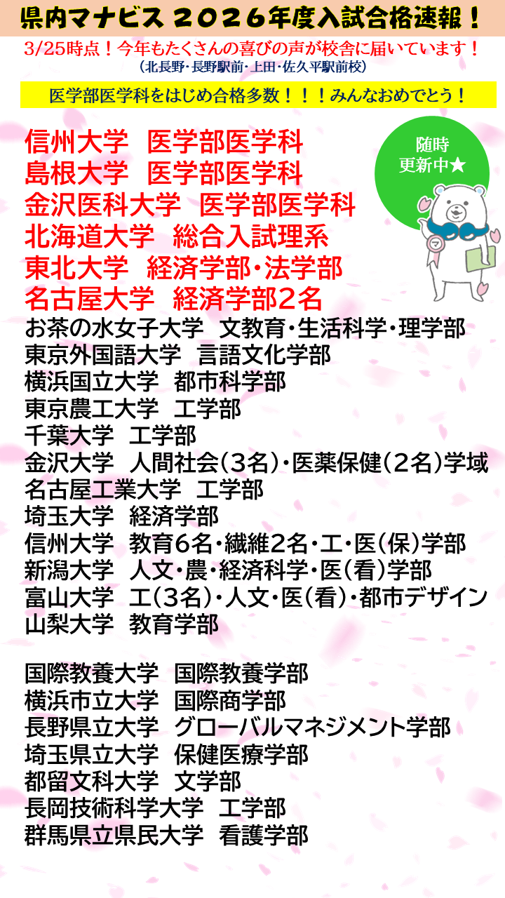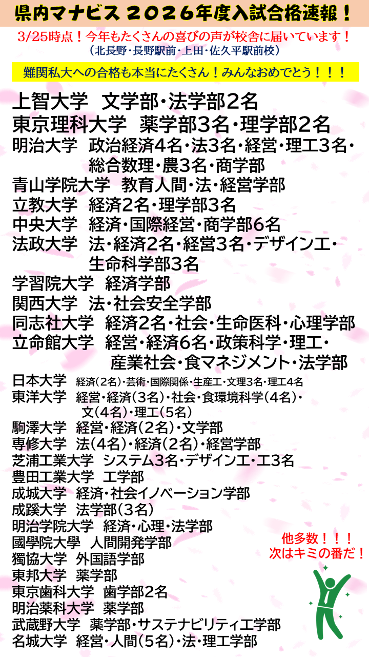 校舎長の山﨑さんをはじめ、アドバイザーの方々の温かいサポートが大きな力になりました。マナビスの講座で早い時期から予習をしていたことで、学校の授業を余裕をもって受けることができ、最終的には問題演習の時間も十分確保することができたので、2次試験に対応できる力がついたと思います。