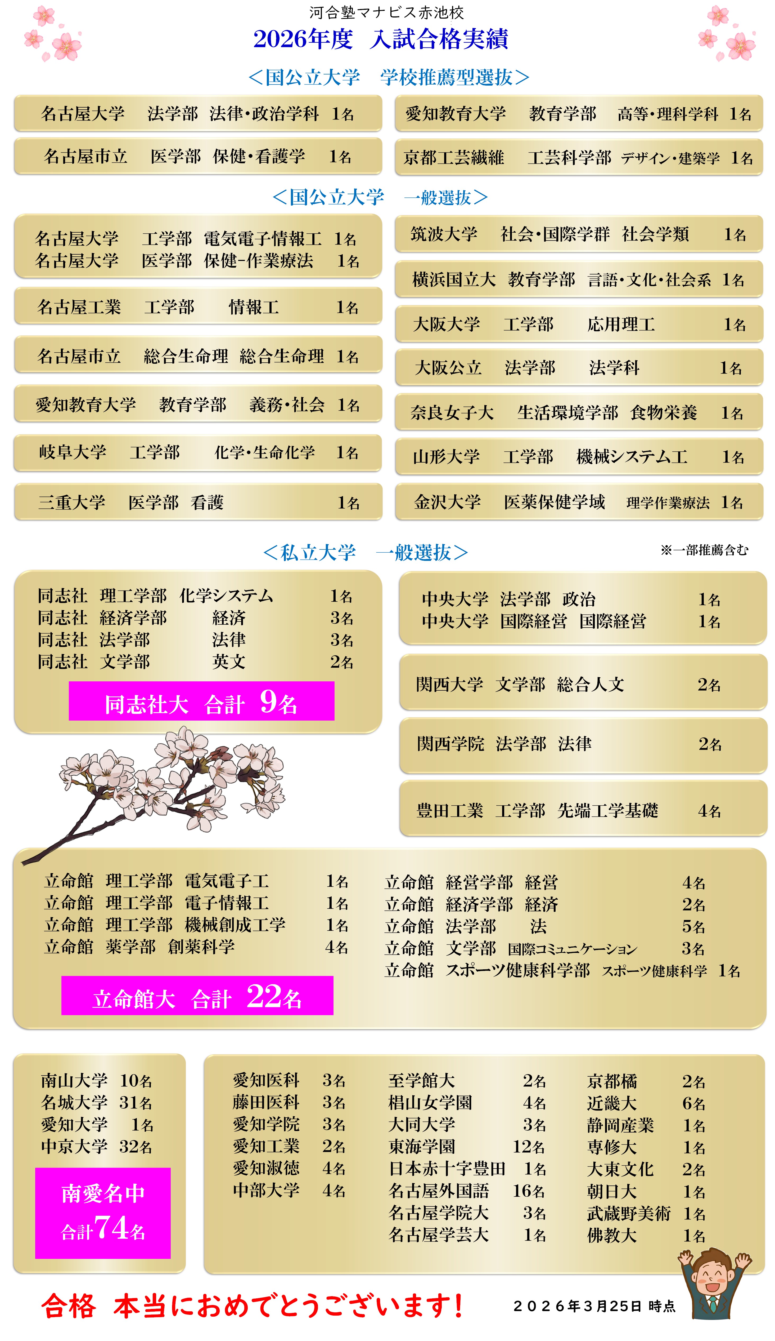 家から近く通いやすいことに加え、名古屋大学のアドバイザーが複数所属しており受験に関する具体的で実践的なアドバイスを受けられたことが大きな魅力でした。また、映像授業なので自分のペースで効率よく学習を進めることができ、忙しい中でも継続して勉強に取り組めました。