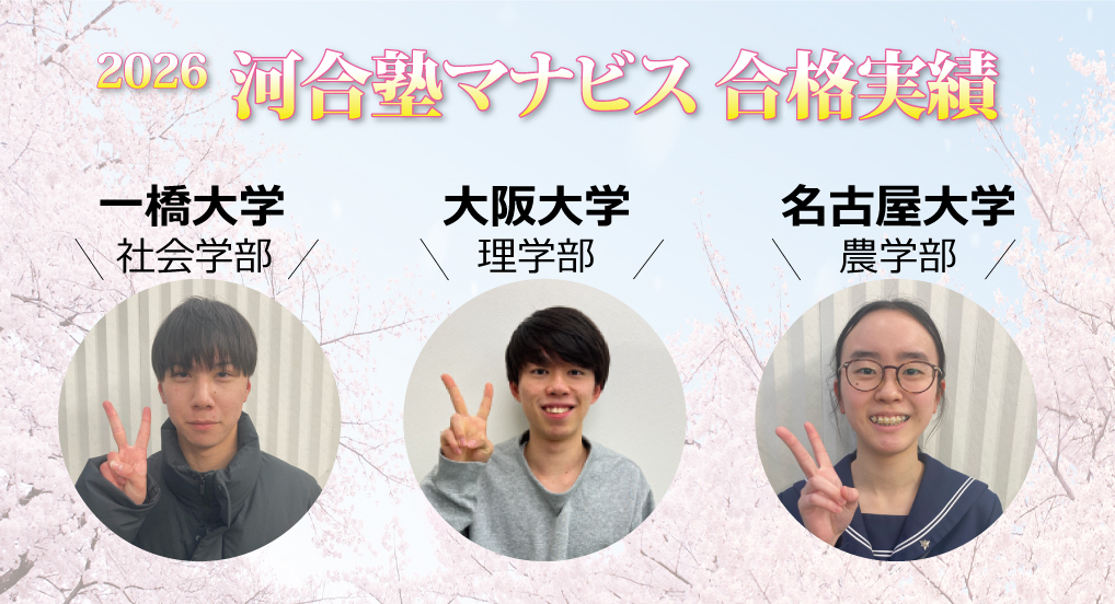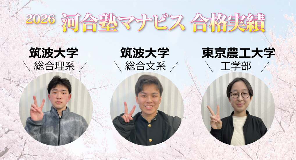高2生の夏から河合塾マナビスに入会しました。特にレベル2の基礎講座で各科目の土台を固めることができたと思います。校舎長はどんなときでも温かく私を励ましてくれて、迷わず勉強を続けられました。受験前日の夜に風邪を引いて睡眠不足でしたが、これまでの積み上げのおかげで合格できました!