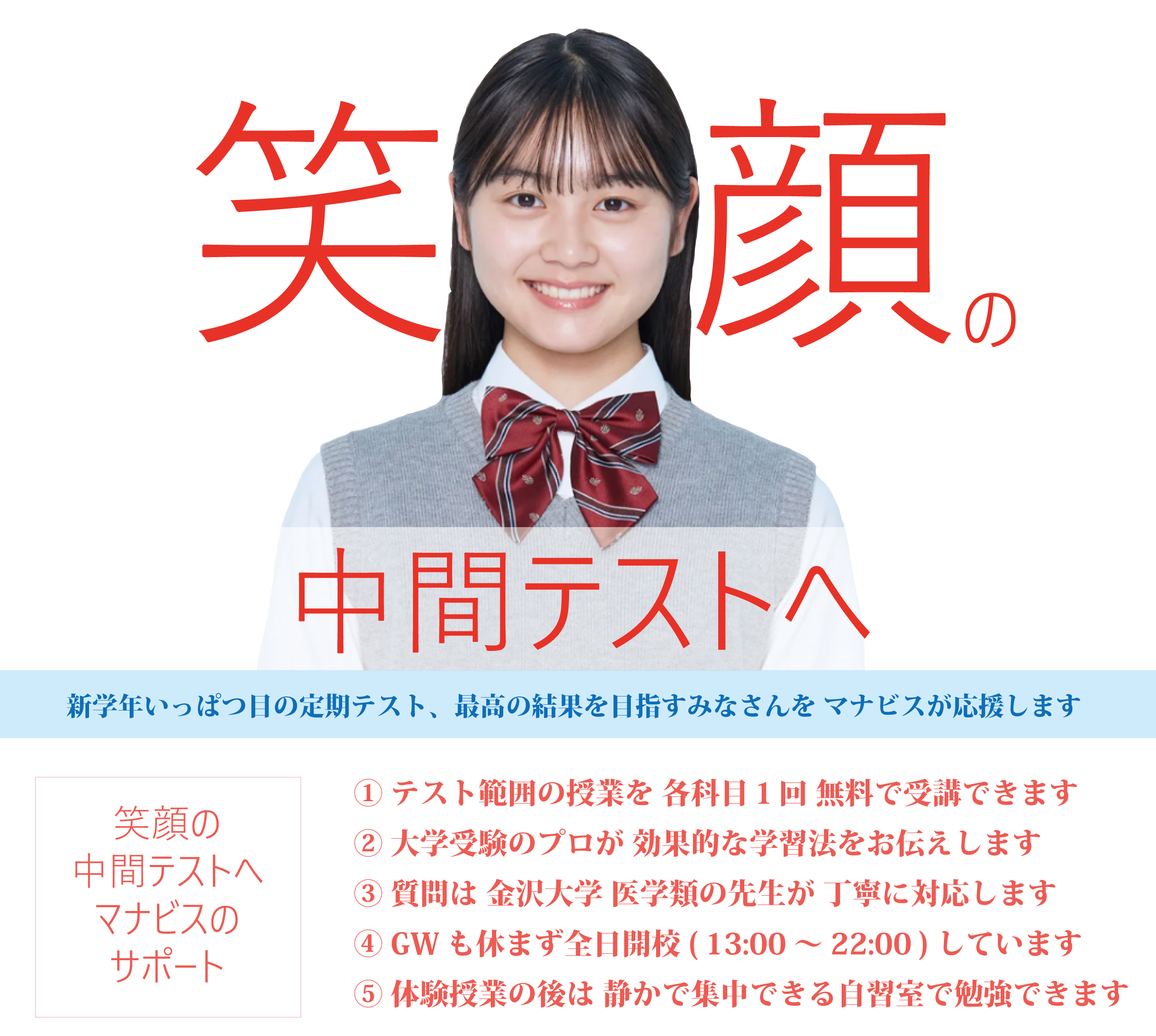 「苦手な数学を中途半端にやるより得意の歴史で偏差値70を目指そう」という校舎長の戦略が全てでした。僕が第一志望に逆転合格したのは。バレーボール部との両立ができたのは河合塾マナビスの立地も大きいと思います。学校帰りに寄って、休憩スペースも充実しており、リフレッシュして受講できました。立地も指導も最高です!!
