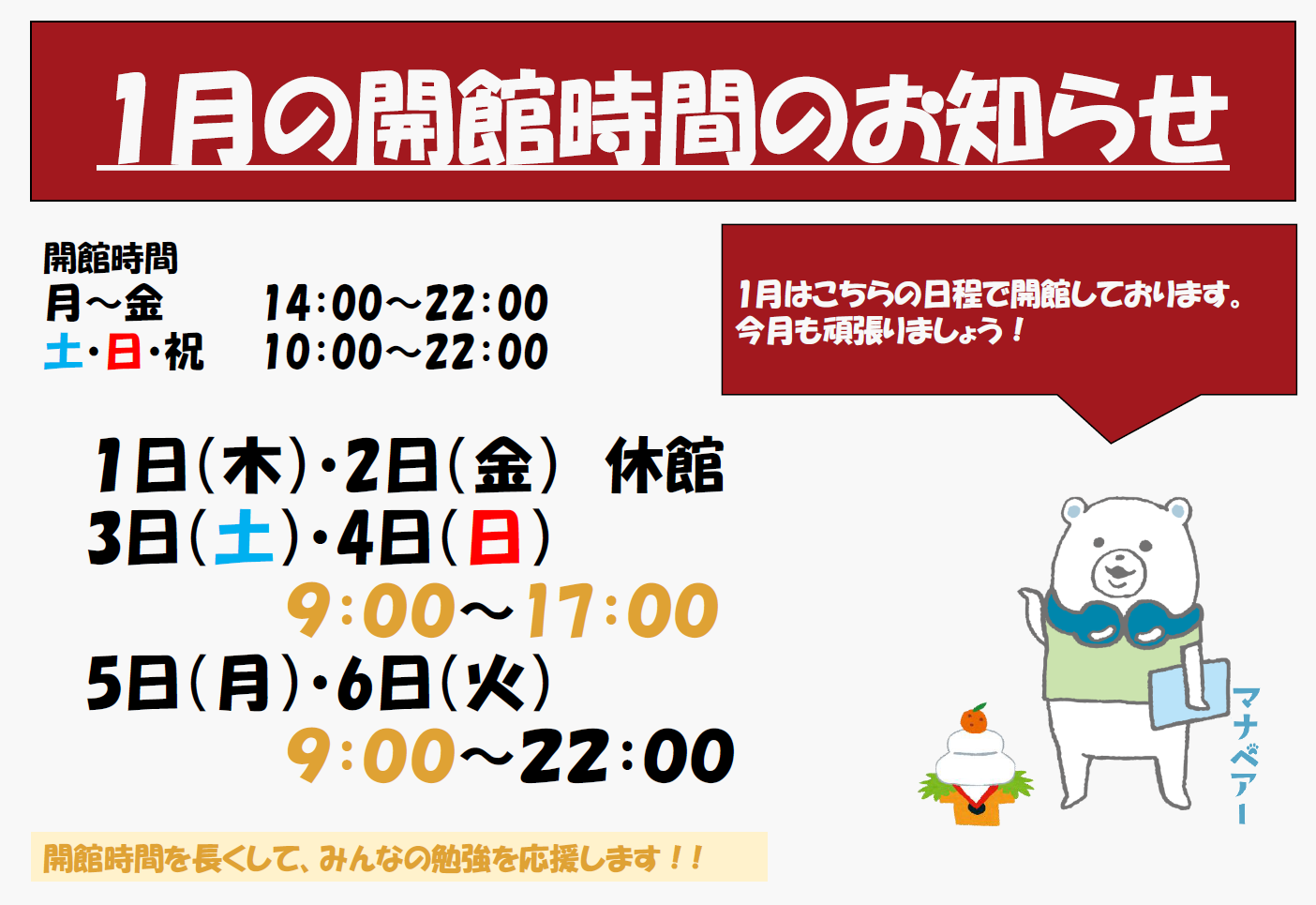 1月1日、2日は休館、3、4日は9:00~17:00、5、6日は9:00~22:00、7日以降通常営業となります。