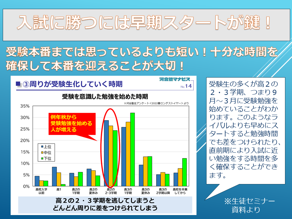 難関大学合格には早期に受験勉強を開始し、ライバルに差をつけることが重要です。