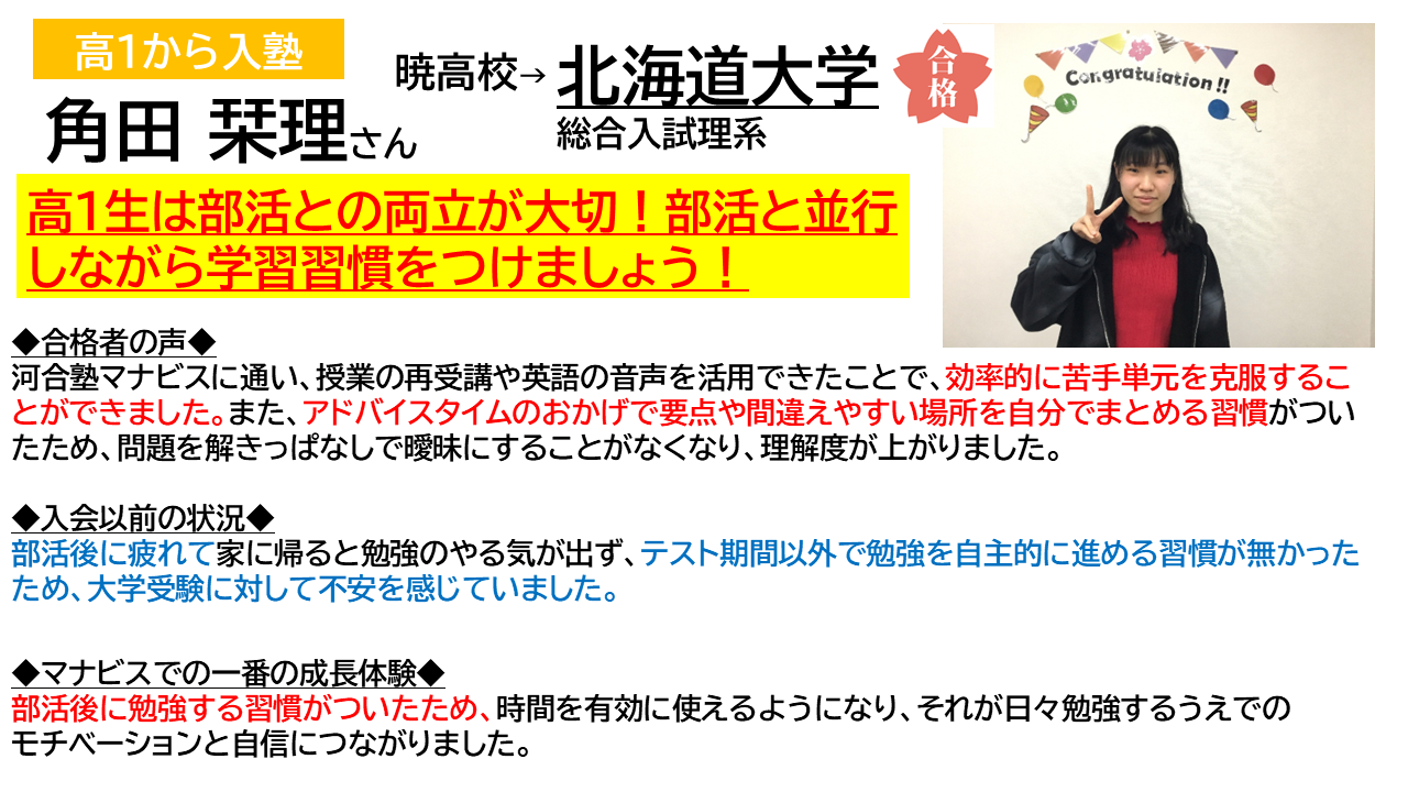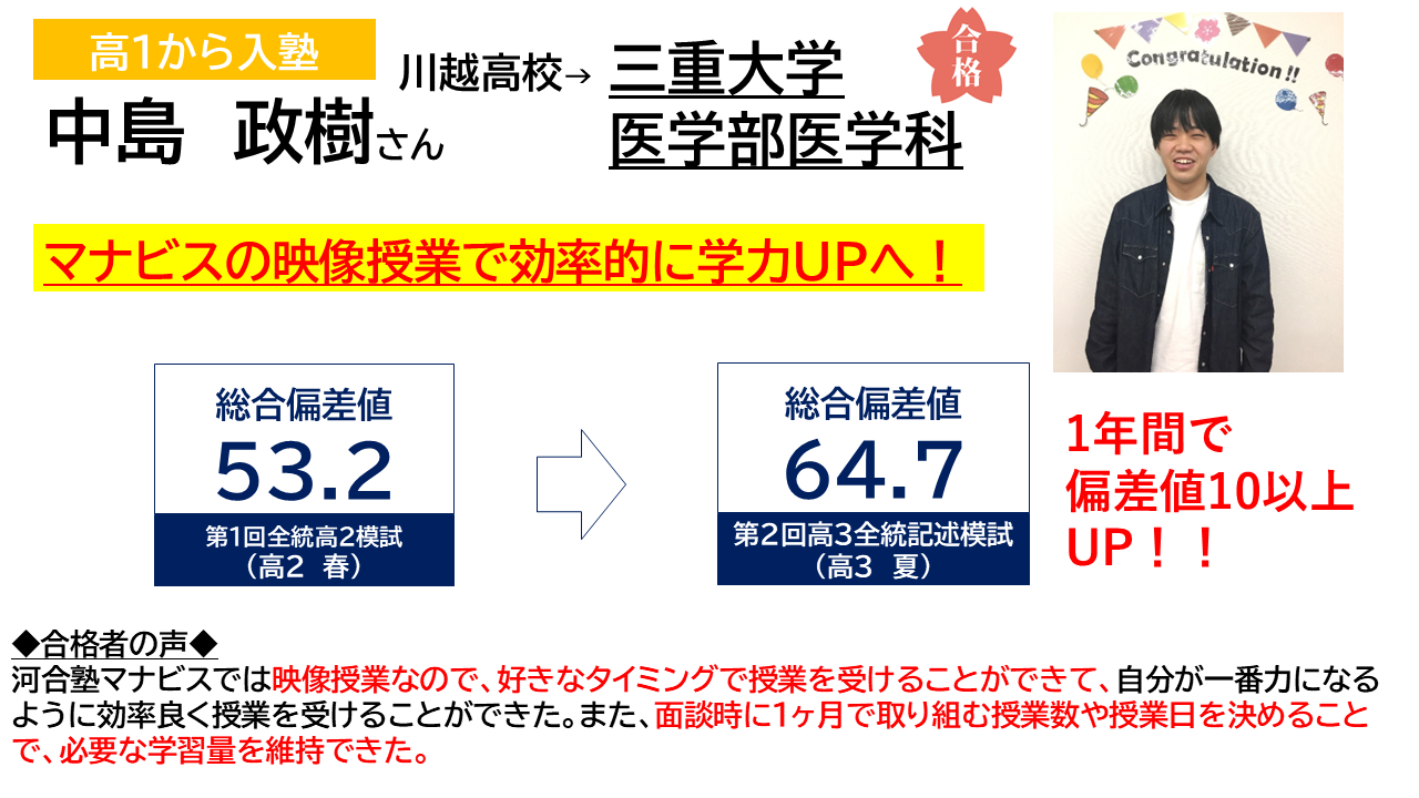 河合塾マナビス四日市校では、高1の内からマナビスで勉強を始めて志望校に合格した生徒が多くいました。