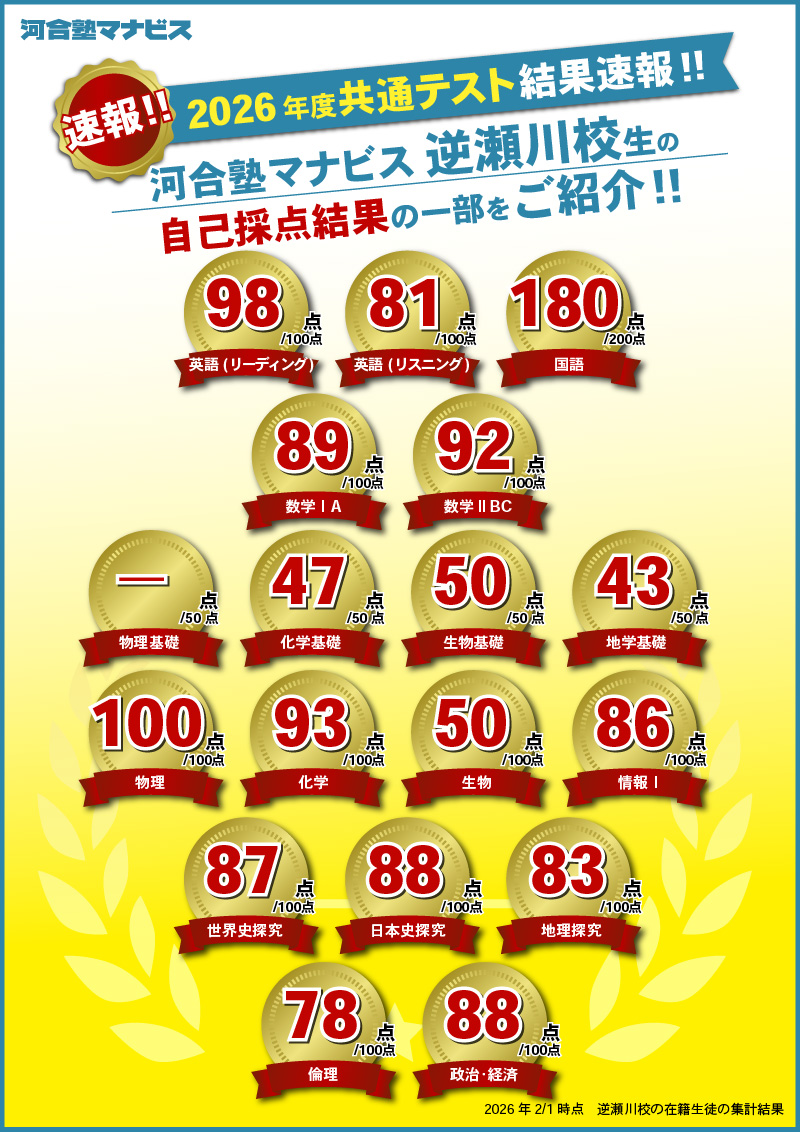 「河合塾マナビス逆瀬川校」から、2026年度大学入学共通テストの自己採点結果(最高得点)が届きました!