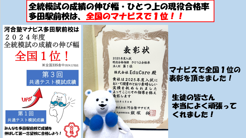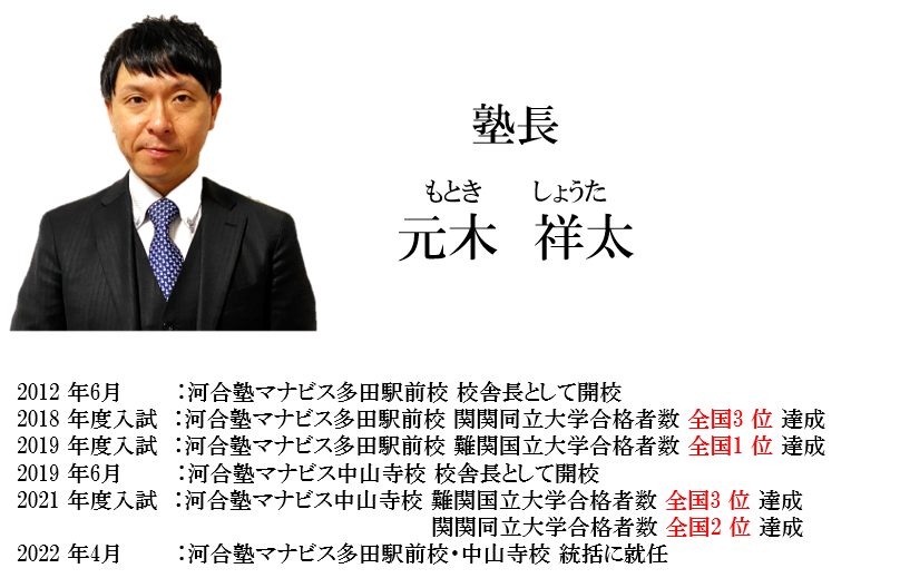僕は高2生の春に河合塾マナビスに入会しました。英語が特に苦手で、基礎からのスタートでしたが本番では得点源にすることができるようになりました。問題の解き方だけではなく、勉強の進め方や志望校の相談までたくさんのサポートのおかげで成長し合格できたと思います。また、面談やセミナーがあり、モチベーションを保つことができました。