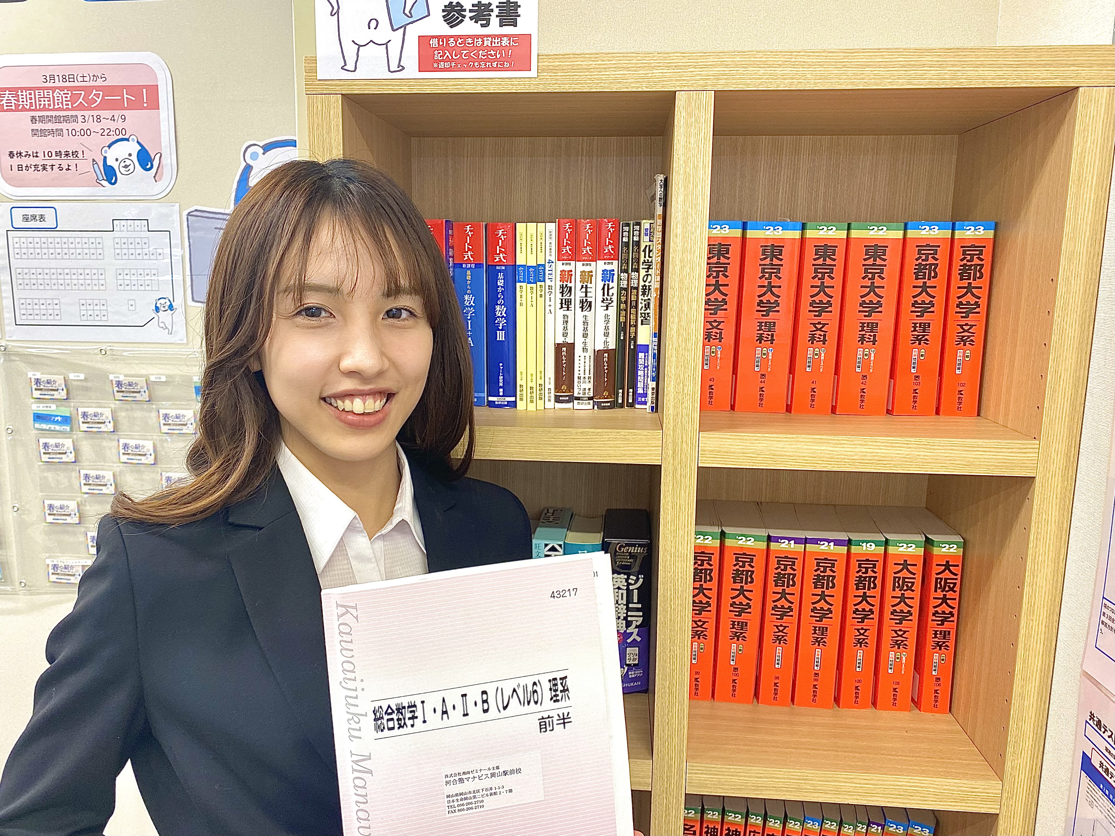 私は、河合塾マナビス入会する前までは、数学が苦手でテストや模試でも低い点数しか取ったことがありませんでしたが、マナビスの講座を受講したり、アドバイザーの方々とのアドバイスタイムや月例面談を通して、少しずつ苦手を克服することが出来ました。