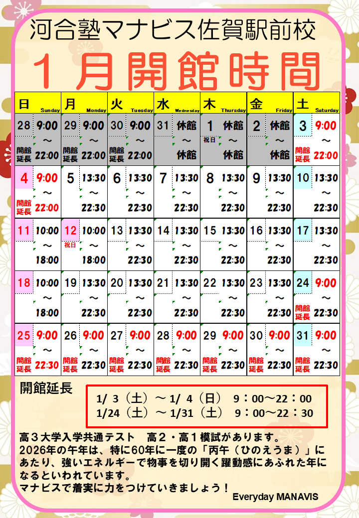 1月の開館カレンダー