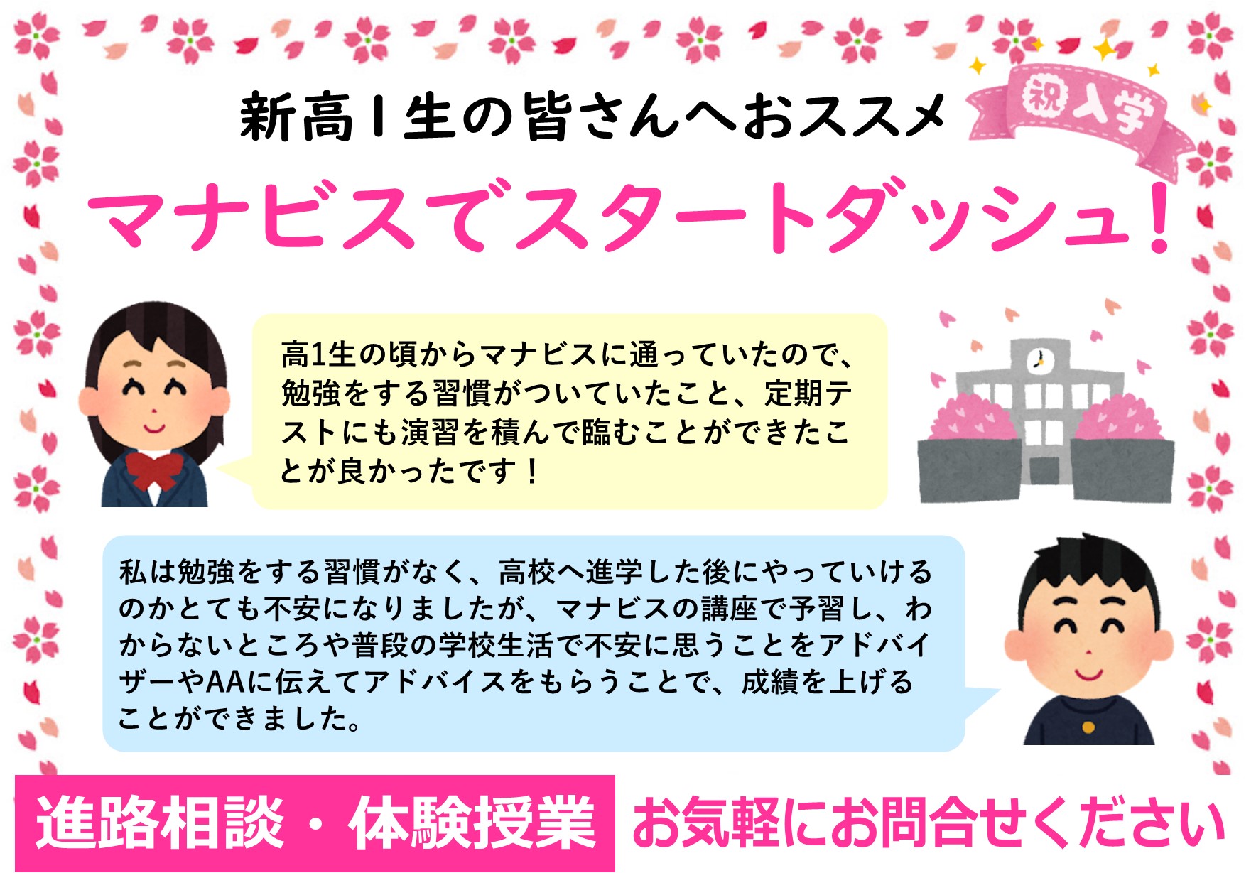 私は勉強をする習慣がなく、高校へ進学した後に、この学校でやっていけるのかとても不安になりましたが、マナビスの講座で予習し、わからないところや普段の学校生活で不安に思うことをアドバイザーやAAに伝えてアドバイスをもらうことで、成績を上げることができました。