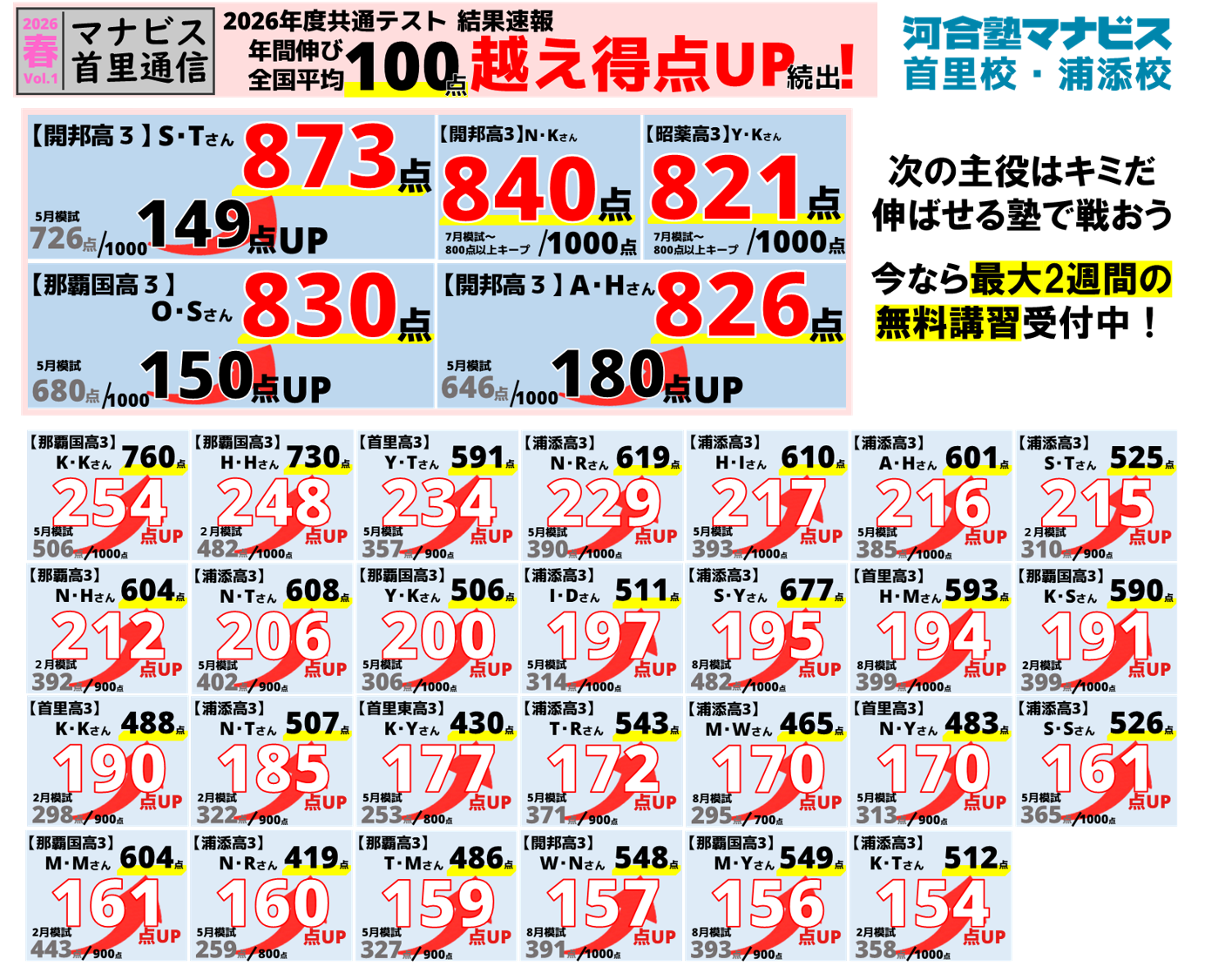 入会するまでは部活ばかりで勉強習慣がなかったが、入会後は勉強する環境が整いわからない点を教えてくれるアドバイザーの方たちのおかげでテストの点が伸びるようになりました。また、河合塾マナビスのテキストはポイントがかなり分かりやすくまとめられていて、模試前に確認をするのにも有用だったので他の教材を使わずに済み楽でとても助かりました。