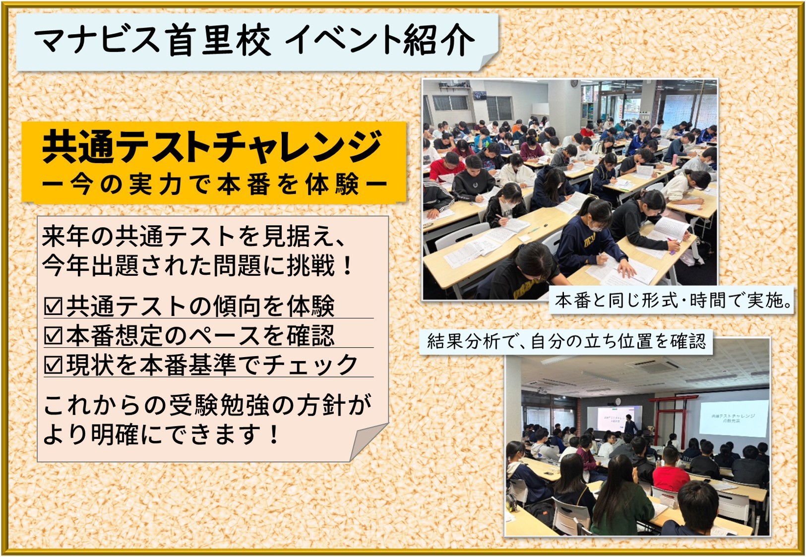 私は生物基礎の点数が取れなくて困っていましたが、マナビスの講座の受講と共テ前の総復習のおかげで、模試の20点台の点数から共テ本番の得点40点まで伸ばすことができました。