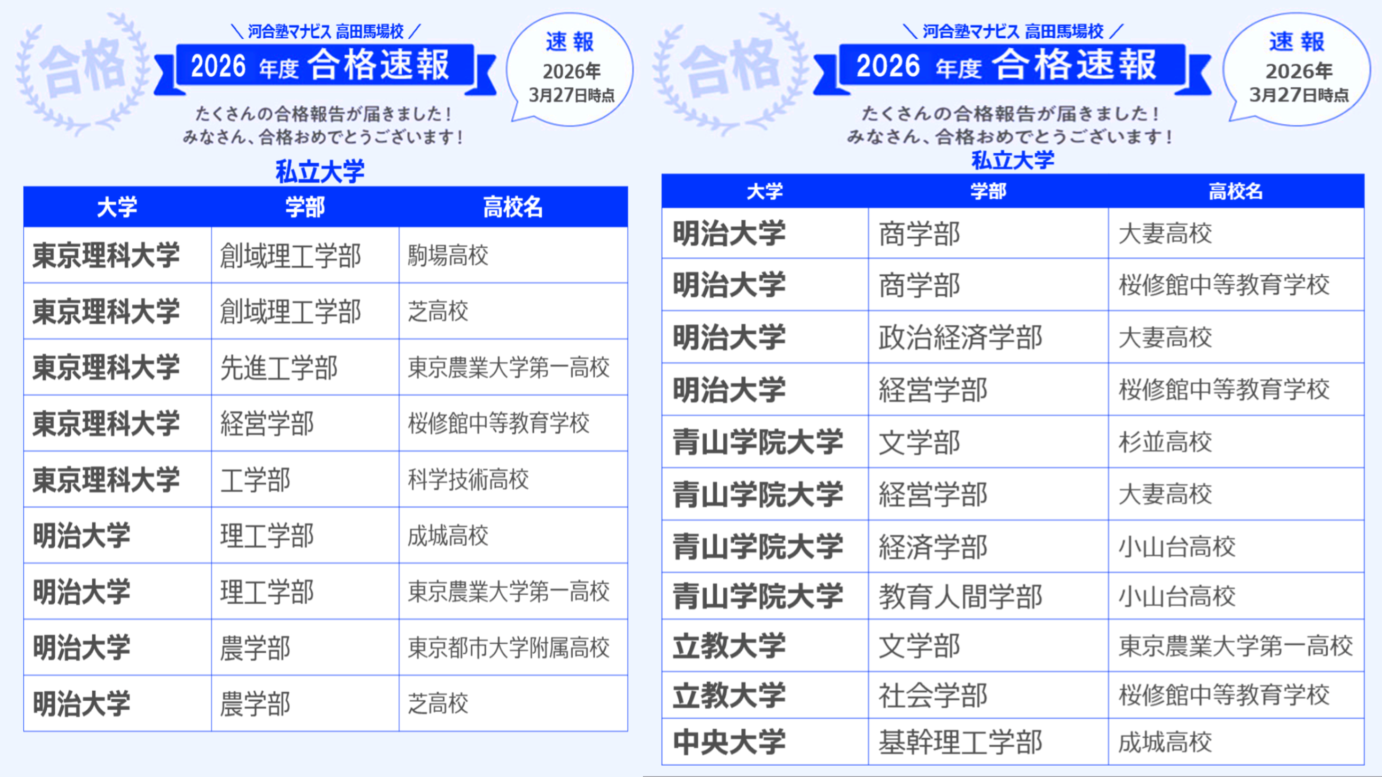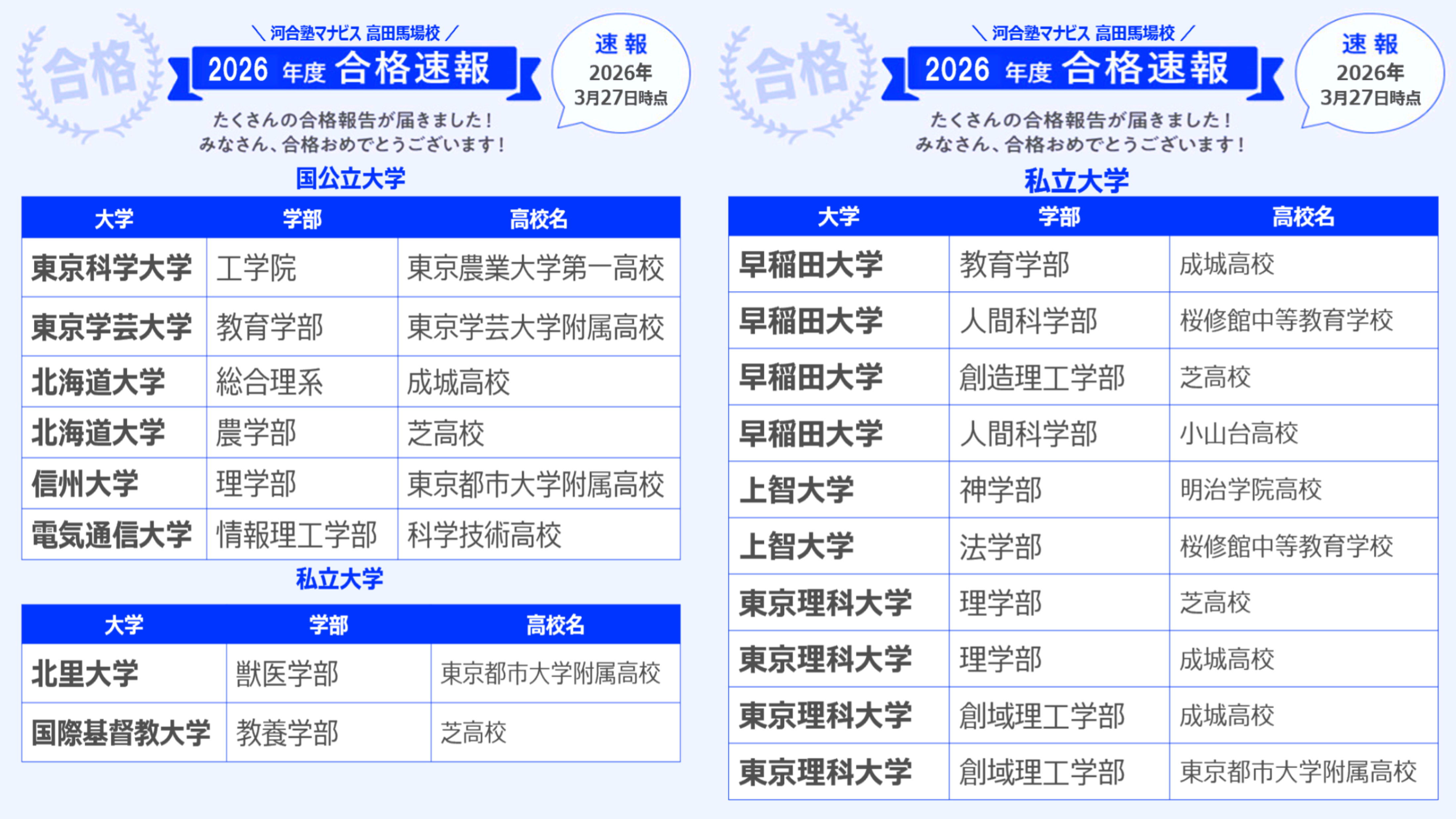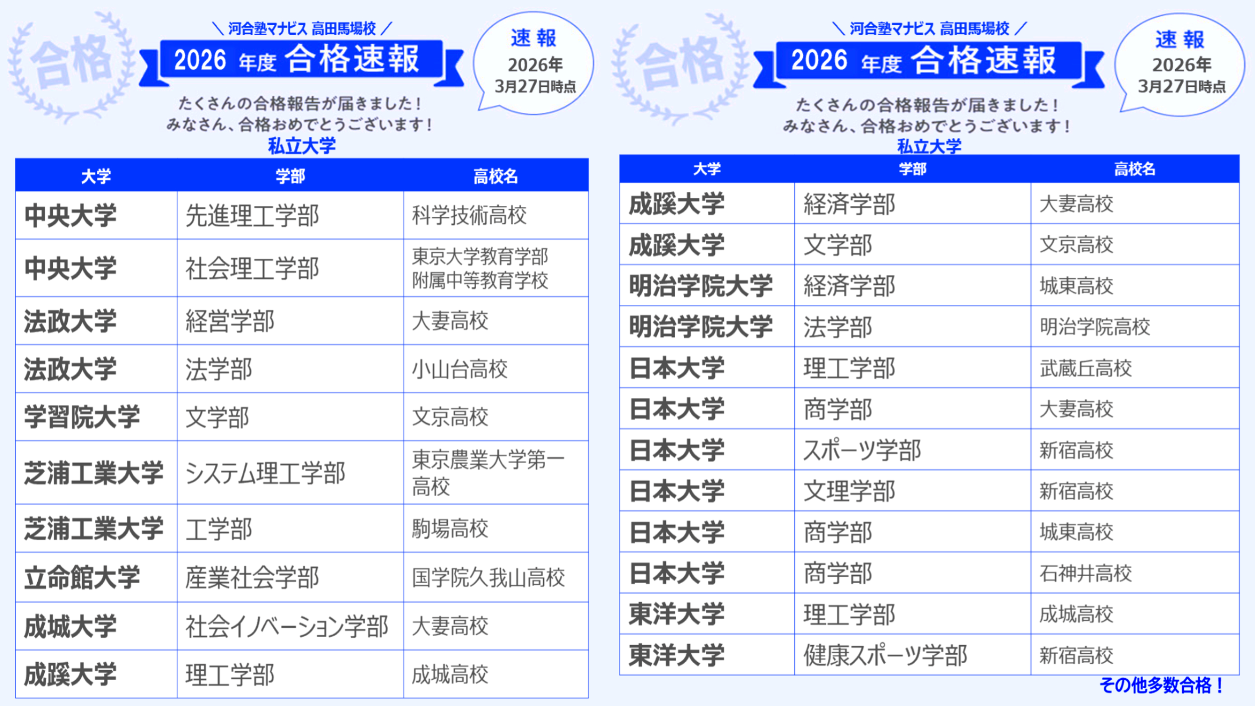中学三年生の時に数学で評定1をとったが、マナビスの総合講座と通っていたことによる分野別の能力の向上、勉強時間の向上を経て、河合塾の東京科学大オープン模試で数学の偏差値が50を超え、学校での最終評定は5だった。