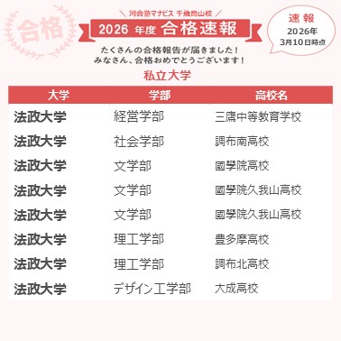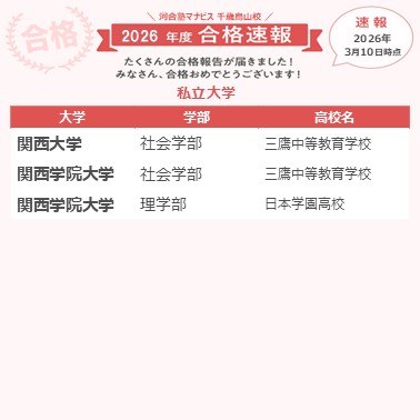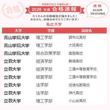 自分には河合塾マナビスが一番合っていたと思う。忙しい部活を考慮したスケジュール管理、月例面談での適切なアドバイス、何回も見返せる映像授業、どれも合格に必要な要素だった。周囲のやる気にも感化され本気になれたし、無理せず通うことができる雰囲気もあったので、楽しく勉強して合格を勝ち取ることができたと思う。