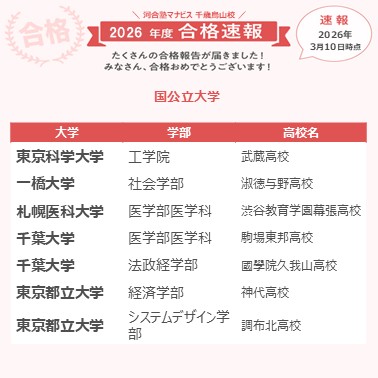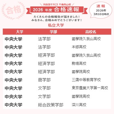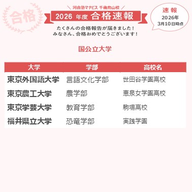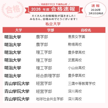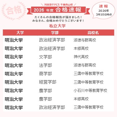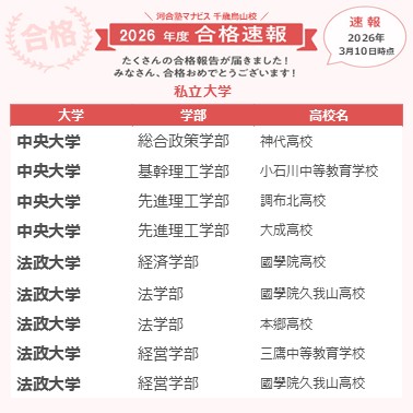 本番が近づいてくると気分が落ちたり自信もなくなったりしましたが来校すると塾長やアドバイザーさんが笑顔で励まして応援してくれて、その会話が良いリフレッシュになりました。直前期は受講の優先度やスケジュールを今の自分の状況に合わせて考えてくれてとても頼もしかったです。