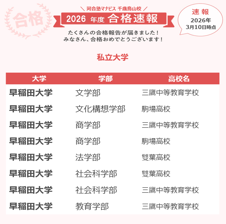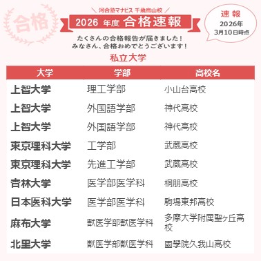 一番は自分のレベルから志望校のレベルまで一つずつ演習、復習を積み重ねて力をつけていけるところが良かった。スタッフの方々を見る度に受かりたいという気持ちが強くなれたことで、二月末まで気を引き締めて頑張り続けられた。校舎に来て、勉強している他の河合塾マナビス生を見るとどんな日もやる気が出た。