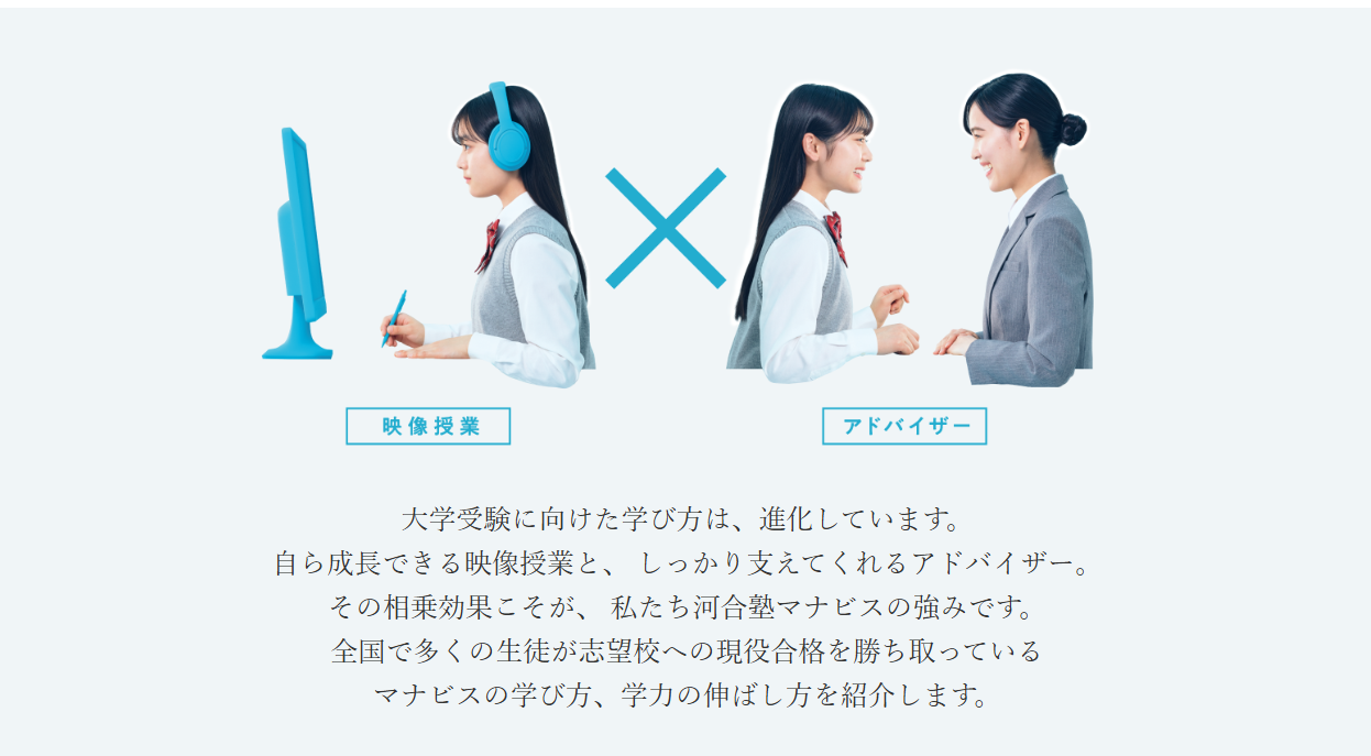 私が河合塾マナビスに通ってよかったと思うことは、自分のペースで映像授業を受けることが出来ることです。1回で理解できなかったところは巻き戻して確認できるし、1度受けた授業を何度も見返すことが出来て、集団や少人数で授業を受けるよりも自分には合っていると思いました。