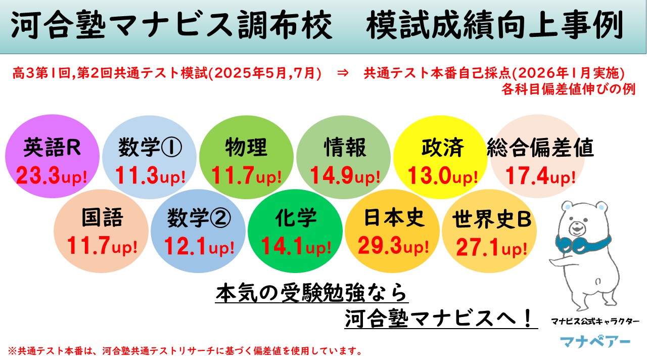 毎日河合塾マナビスで勉強することで学習習慣が付き、生活のリズムも整ったことが良かった。英語が他の教科と比べて基礎的なことが身についていなかったが、文法や語法から学習し直すことが出来たので役に立った。周りの目を気にせず、自分のペースで学習することができたので、じっくり自分の苦手なところに向き合えた。