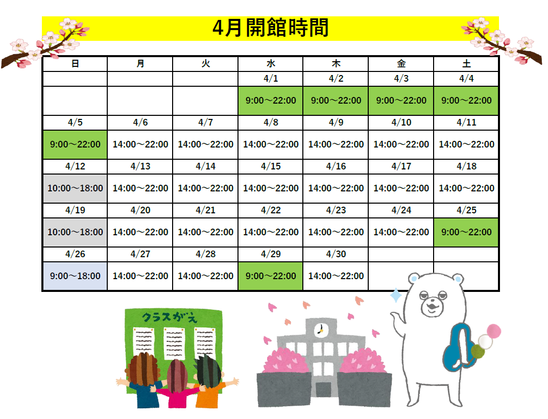 4月開館時間のお知らせです。