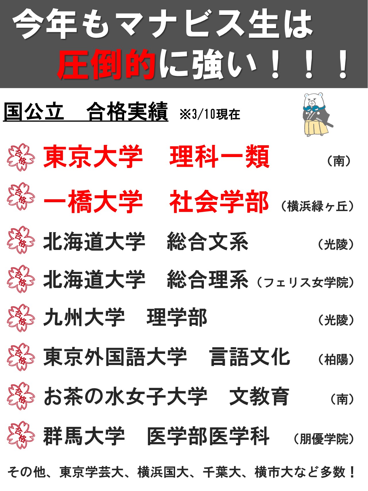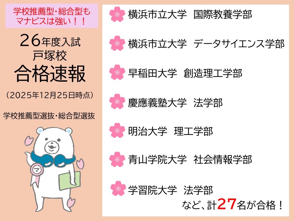 河合塾マナビスの講座を受けてみて、本当にわかりやす講師が多く、苦手な分野もたったの90分間理解し、その後逆に好きになる分野もありました。テキストの問題も非常によく、実際の入試でも同じような問題が出て助かりました。また、自分の予定に合わせて受講日を決められるので、部活との両立も苦労しなかったです。