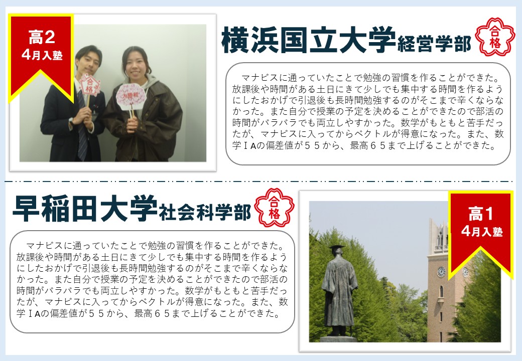 マナビスに通ったことによって勉強の効率が上がったと思います。予習・演習・復習の流れがあったことによって、覚えるスピードも定着のスピードも上がり、総合型との両立を叶える支えにもなったと感じています。