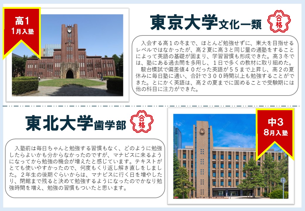 マナビスに通って良かったことは、自分のペースで学習を進められたことです。毎日講座を少しずつ入れることで、毎日マナビスに寄るきっかけとなり、ペースを作ることができました。また、相談したいことがあるときには頼れるアドバイザーさんや社員さんのおかげで前向きに受験に臨むことができました。